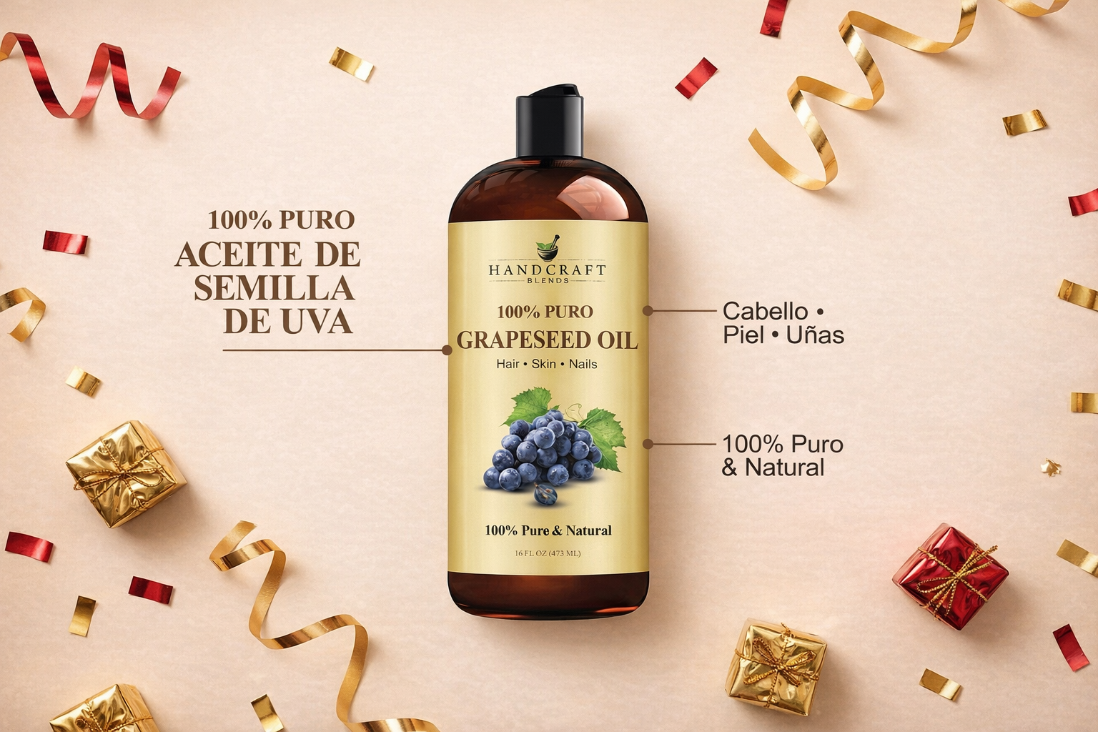 Aceite de Semilla de Uva Orgánico | Cuidado Natural para Piel, Uñas y Cabello | Ligero, No Graso y Vegano | (473 ml)